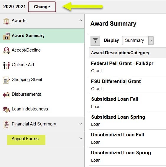 Note: At the top left, you will notice an aid year. You may select the ‘Change’ option to select the correct year for which the appeal applies to.