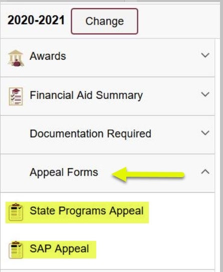 By selecting the ‘Appeal Forms’ option that is tied to the correct aid year, you will gain access to the online form to submit your appeal. Your academic data determines which appeal option you are eligible to submit. In some instances, you might see both forms: State Programs Appeal and SAP Appeal. To file an appeal, please select the option that pertains to the type of appeal you want to submit.