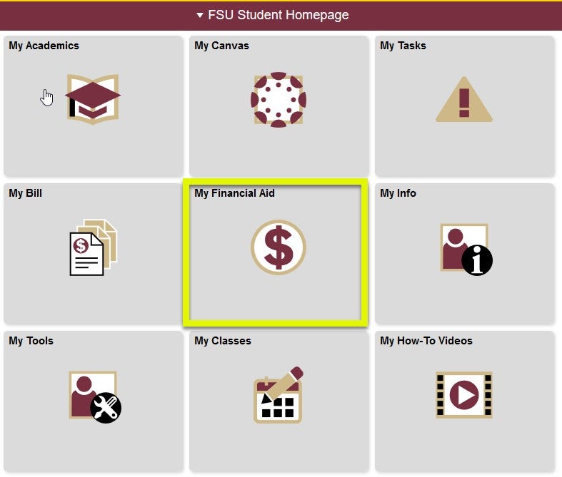 Now that you’ve selected the ‘SC’ icon located on your MyFSU portal, you will be directed to your Student Central FSU Homepage. This homepage will showcase various tiles which will allow you access to view your financial aid, register for classes, and pay your tuition. To access an appeal form, you will need to select the ‘My Financial Aid’ tile.