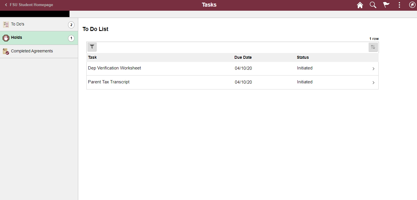 6. You may have other holds on your account. To remove them, click on the Holds option on the left side menu. You will be taken to the Holds page and can view your Holds similar to how you view your To Do list items. Complete the required steps for each hold to remove them from your account