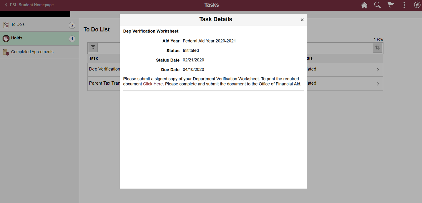 4. After you click on an item, a popup window will display additional information on the actions you need to take to complete the item and remove it from your To Do list
